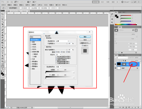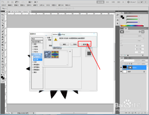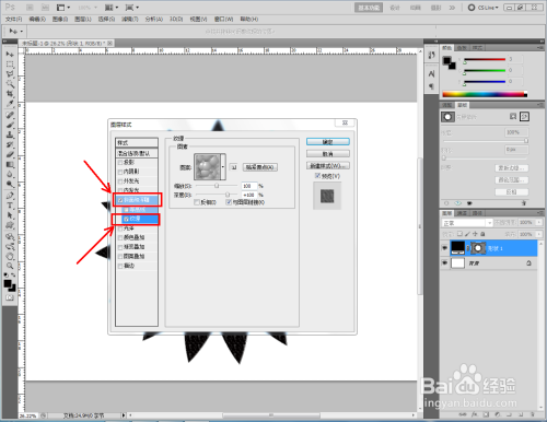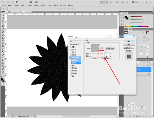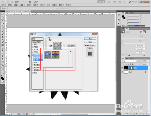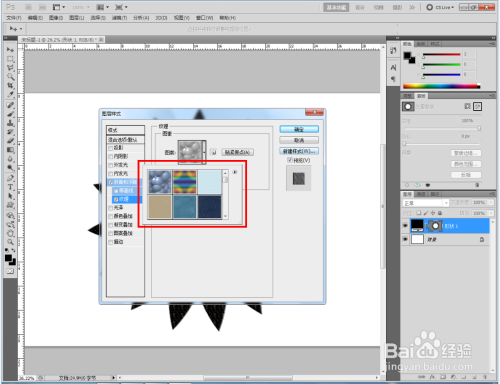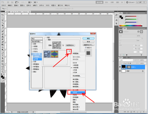 双击图示自界说图案图层,弹出图层样式设置栏。勾选【斜面和浮雕】-【纹理】,点击图示小三角,弹出图案选项栏;