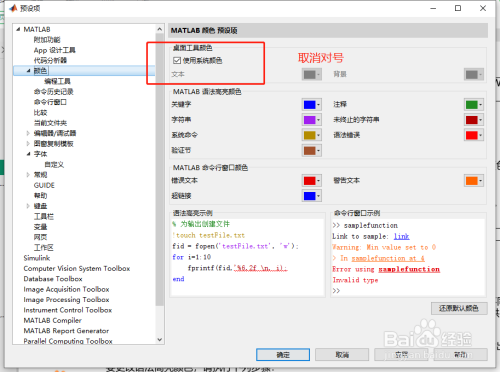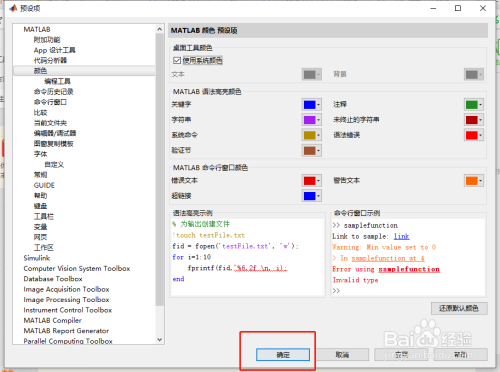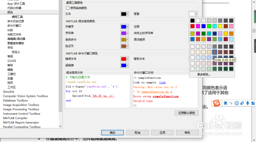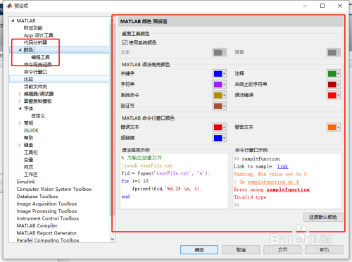 选择颜色时,会更新对话框中的语法高亮示例和号令行窗口示例区域以便标的目的您显示外不雅。