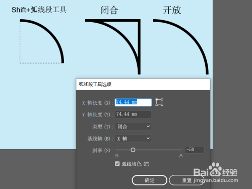 直接点击画板空白处,可以进入“弧线段东西选项”设置卡,可以直接进行弧线的绘制。