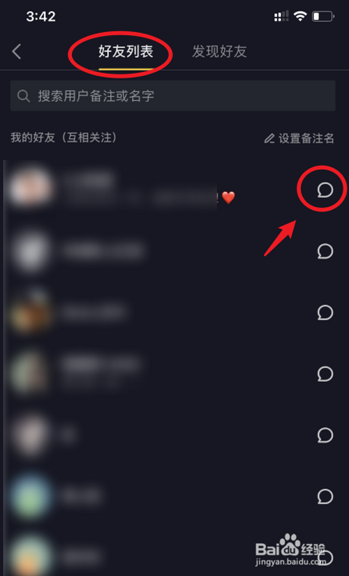 4.选择老友列表,找到需要视频通话的老友,点击发动静的图标。