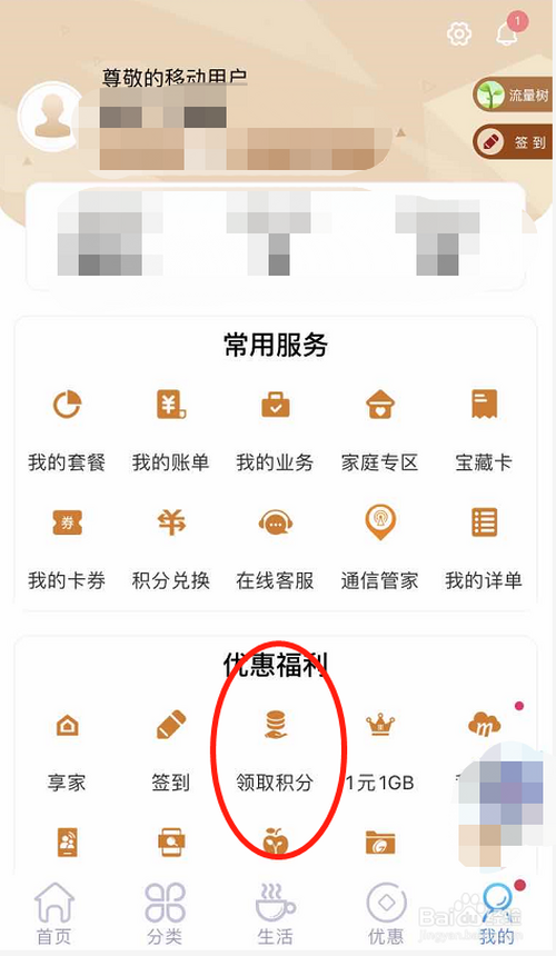 在小我本家儿页内,可以在优惠福利板块内找到“领取积分”的按钮,点击。