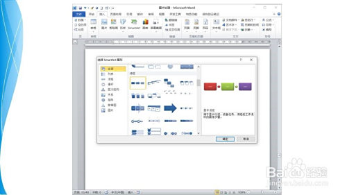 点击插入选项卡——插图组——SmartArt按钮。在跳出的对话框架中选择根基流程图图。