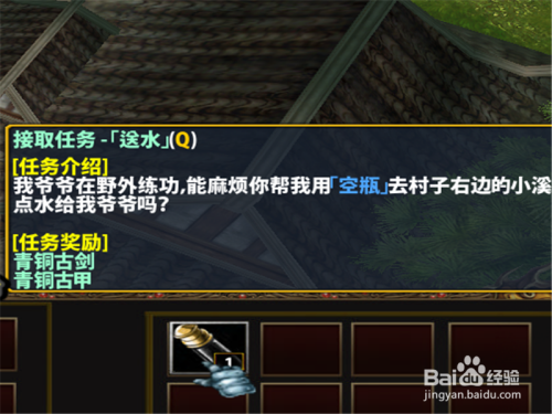 和这个npc互动,只需要接近即可,这样我们就可以完当作使命,获得新手装备了。