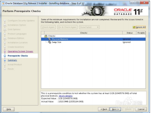 因为这里用虚拟机安装,所以内存较小,但此处该错误可以点击“Ignore”忽略,点击“Next”。