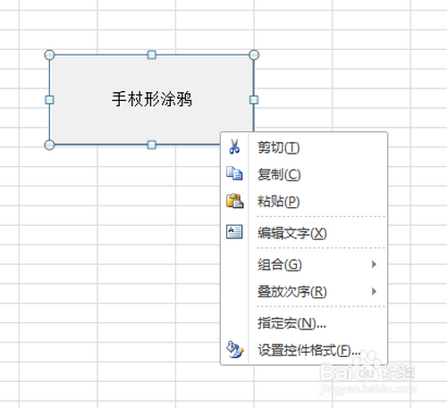 7.将按钮控件定名为“涂鸦拐杖形”,然后点击右键,选择“指定宏”选项。