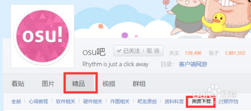 然后,我们在osu贴吧中,找到“精品”栏目,并在精品栏目中,找到“资本下载”选项,这样我们就可以进入贴吧的皮肤的资本库(同时也包罗谱面或者皮肤等良多其他资本)