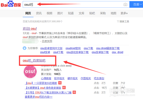 起首,我们需要在搜刮引擎中搜刮“osu吧”,点击搜刮今后,我们便可以在弹出的界面中找到“osu吧”的百度贴吧选项,我们点击进入osu贴吧。