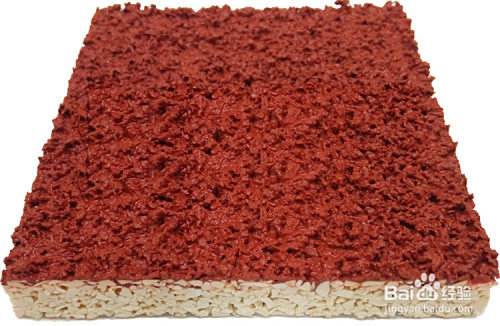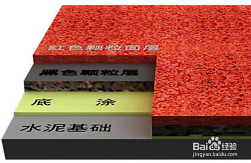 复合型塑胶跑道根本层为聚氨酯树脂粘合的黑色环保橡胶颗粒,面层为有色EPDM橡胶颗粒浇铸在聚氨酯树脂中。