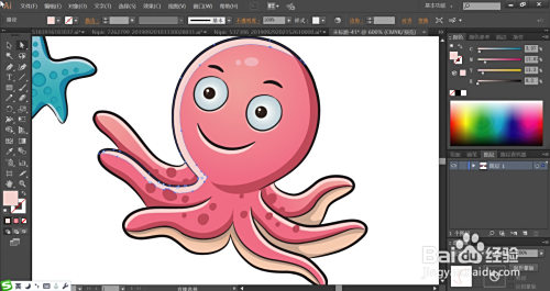 接着,我们用粉红色填充右侧的八爪鱼的路径,再用暗粉红色填充身体下方的边缘暗光,再用桃红色填充身体上方边缘的亮光路径。