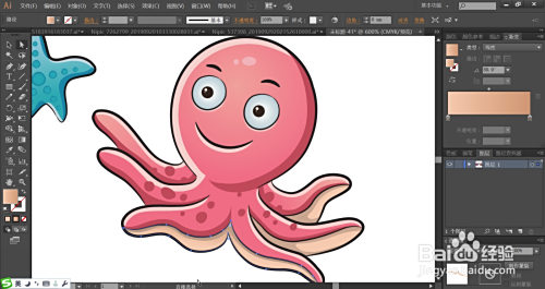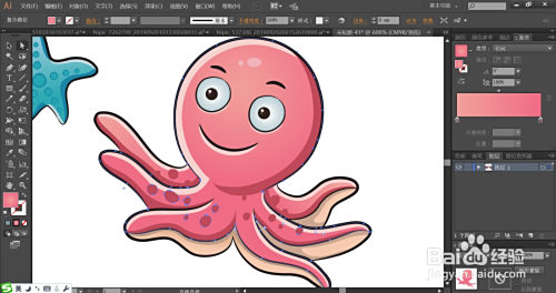 八爪鱼身体上面的圆点图案用暗粉红色填充,利用黄粉色的渐变填充八爪鱼下方的触脚薄膜路径。