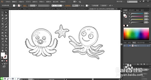 利用钢笔画出八爪鱼的根基身体轮廓,再画出上边缘与下边缘的分歧光线路径,利用圆形东西画出八爪鱼的眼晴与嘴巴的细节路径,接着,我们用钢笔画出中心的海星的身体路径与圆形的图案路径,再描画一下海星的边缘光线路径。
