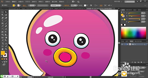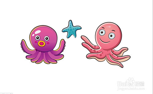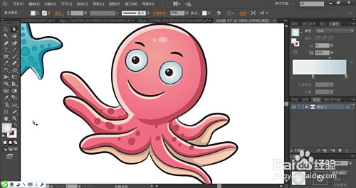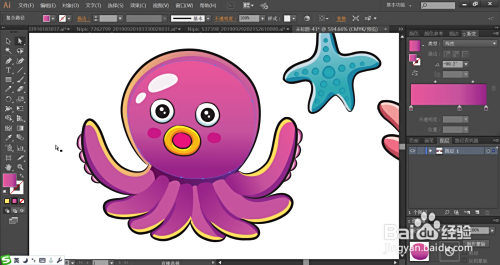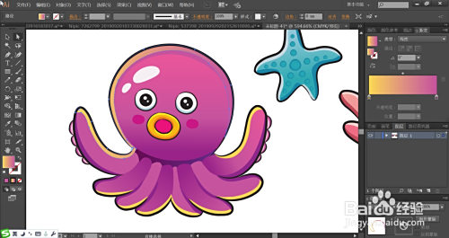 利用梅红色填充嘴巴的内部,再用橙黄色与黄色搭配填充嘴巴的外边缘,脸晕用梅红色填充。八爪鱼的的眼晴用灰白色填充眼白,用蓝黑色填充瞳孔,再用网格东西点击瞳孔让其呈现渐变色,完当作紫红色八爪鱼图片设计。