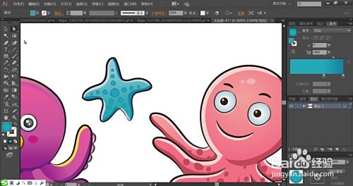 八爪鱼的眼晴用天蓝色的渐变与黑色搭配填充,嘴巴用桃红色与黑色搭配填充。
