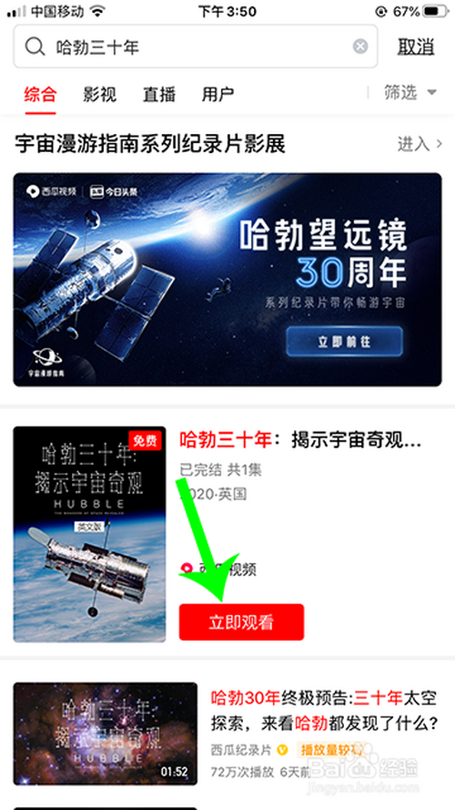 搜刮出后,点击“哈勃三十年《揭示宇宙奇不雅》”右下方的“当即不雅看”。视频就可以播放不雅看了。