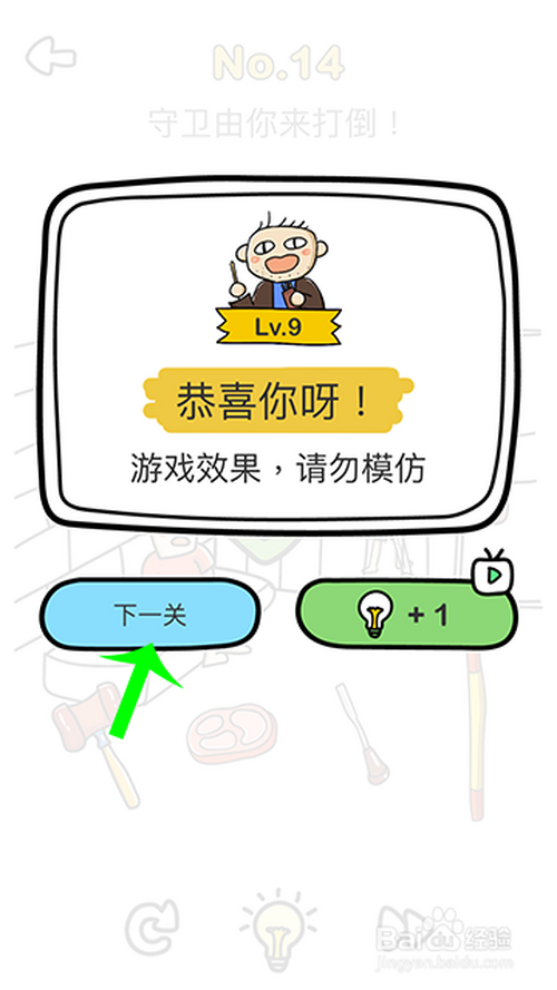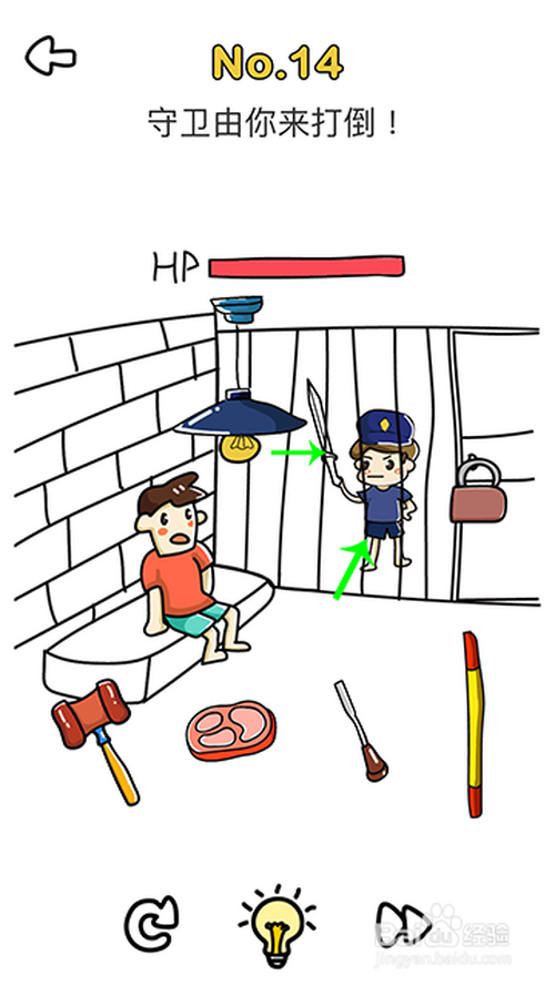 1.进入第14关后,将门卫手里的刀移动到腰那,14关通关,点击“下一关”。