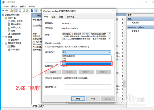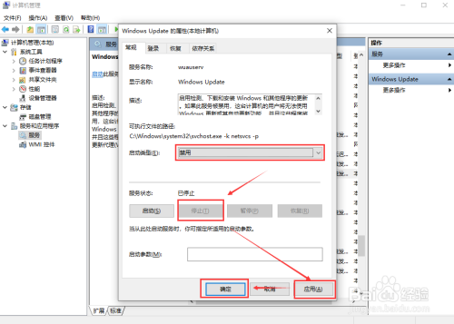 滚动滑轮,鄙人方找到“Windows Update",双击进去,在"常规”,将“启动类型”改为“禁用”,然后点击下方的”遏制“,再点击"应用",最后确定。