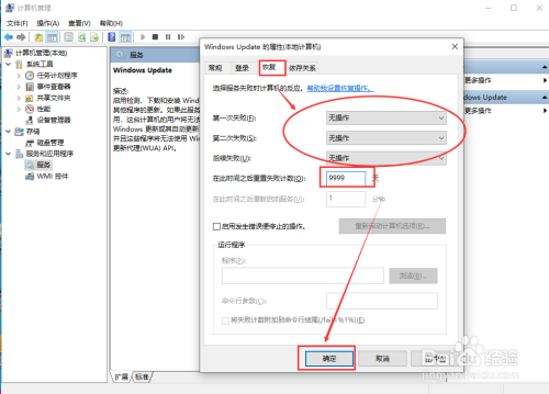 再一次进入“Windows Update",将"恢复“的"第一次掉败、第二次掉败、后续掉败"均改为"无操作",鄙人方的重置掉败计数改为9999天。最后确定。OK