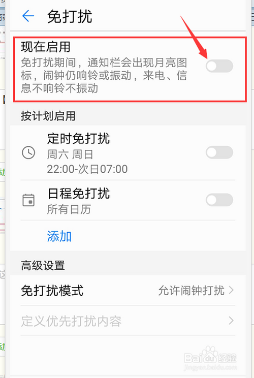 点击【此刻启用】开关,直接开启免打搅,闹钟会正常响铃或振动。这个时辰就无法按打算来启用免打搅。