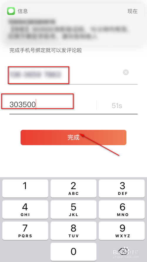接着,我们输入手机号,并获取验证码后填入,点击【完当作】按钮。