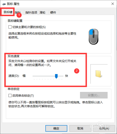 在鼠标属性页面点击“鼠标键”,接着在“双击速度”中就可以拖动滑块设置鼠标的双击速度