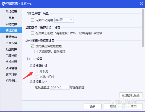 在“垃圾提醒机会处”将“开机时”打消勾选,最后点击右下角处的“应用”并“却定”即可。