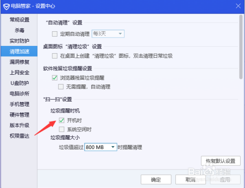 在“垃圾提醒机会处”点击“开机时”,最后点击右下角处的“应用”并“却定”即可。