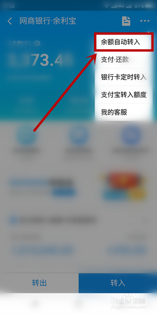 开启支付宝余额主动转入余利宝的具体步调如下: