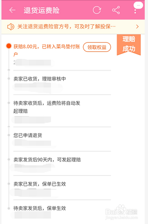 运费险显示理赔当作功会显示已经赔付到账账户。