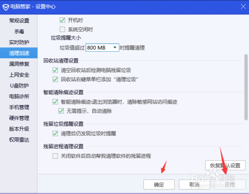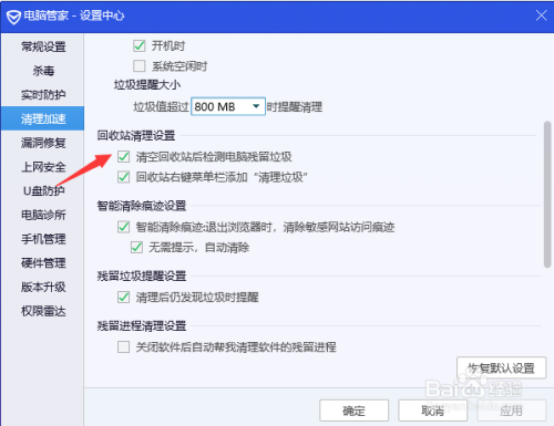 勾选“清空收受接管站后检测电脑残留垃圾”复选框,最后点击右下角处的“应用”并“确定”即可。
