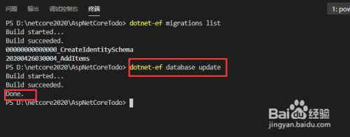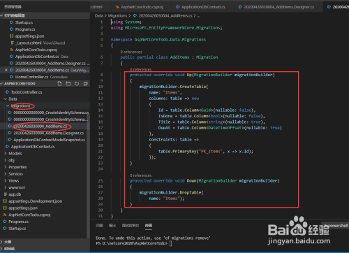 在Visual Studio Code中建立ASP.NET Core MVC项目,然后设置装备摆设好相关EF办事后,我们在终端中输入