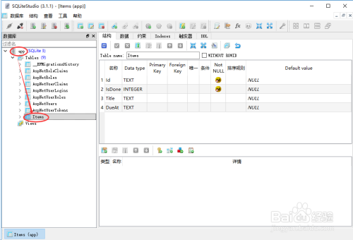 我们用的是SQLite数据库办理东西打开我们刚新建立的数据库app,可以发现下面多了一张表Items,如下图所示: