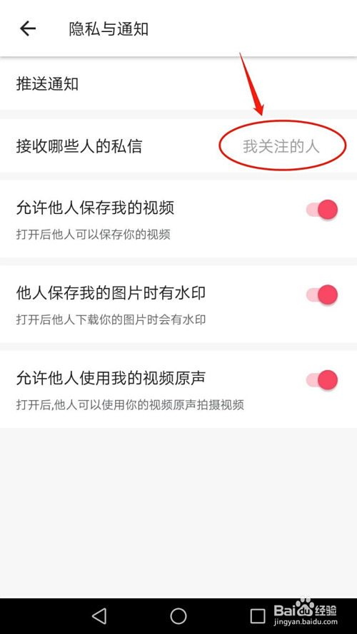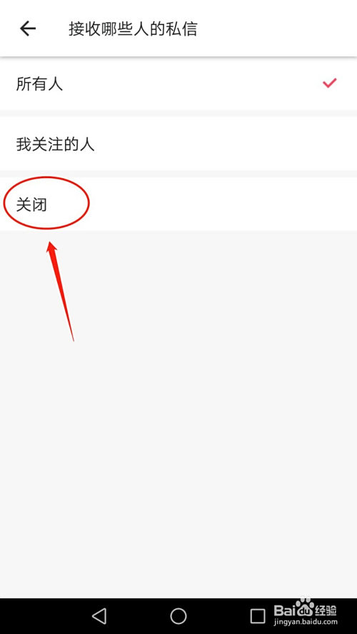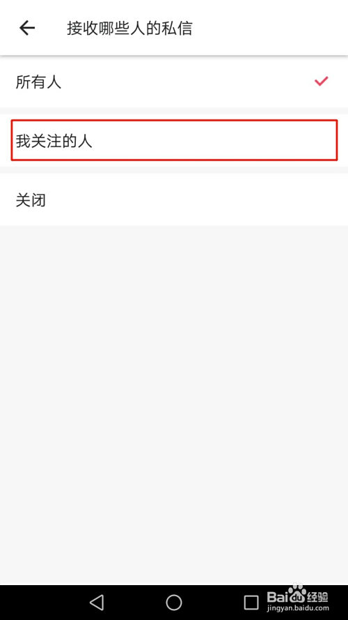 进入领受哪些人的私信页面,按照小我需要点击选择。本例中选择“我存眷的人”选项。