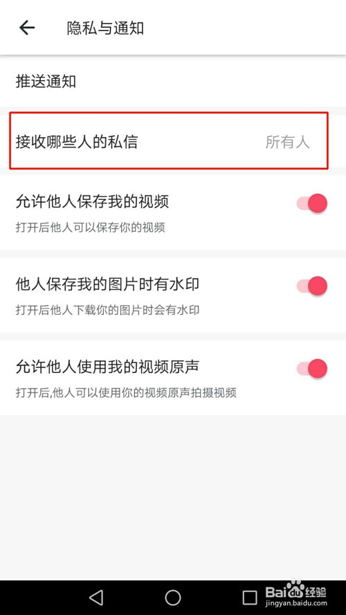 进入隐私与通知页面,点击“领受哪些人的私信”的选项。