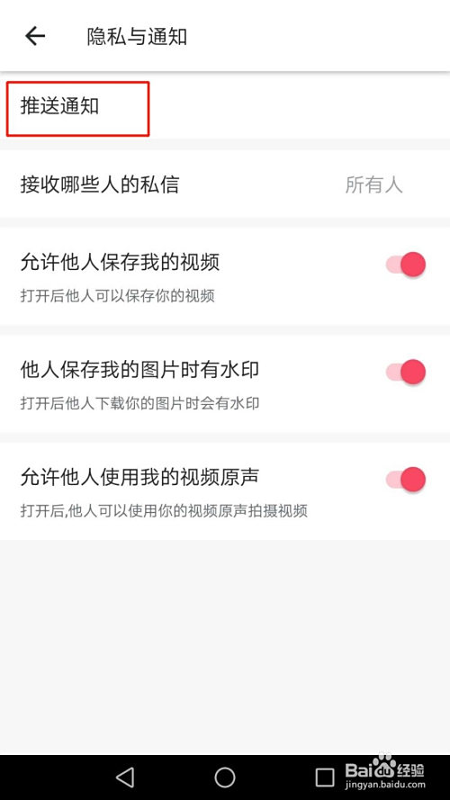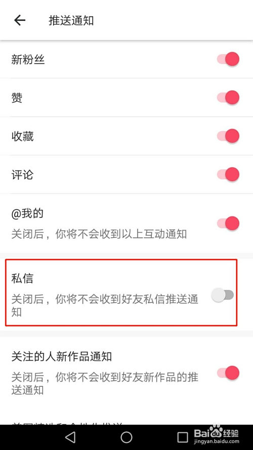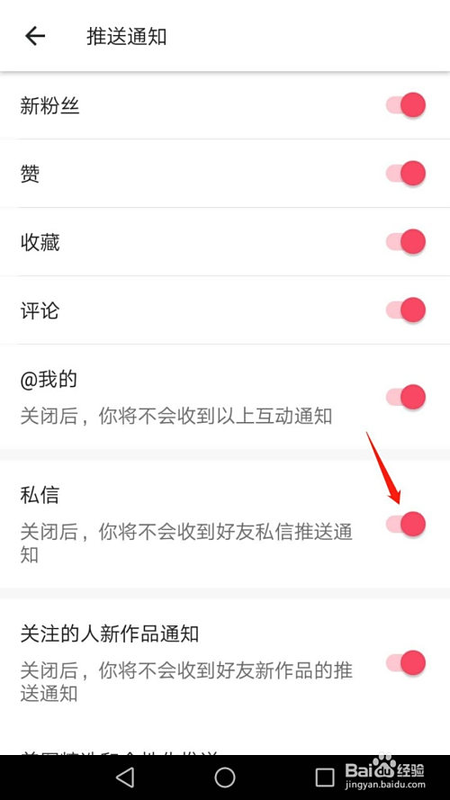 进入推送通知界面,点击“私信”的红色开关,将其封闭。