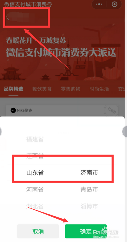 第四:进入消费券领取界面点击左上角的【定位】选择山东和本身栖身城市。