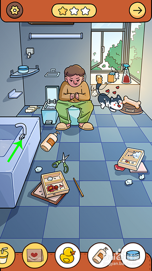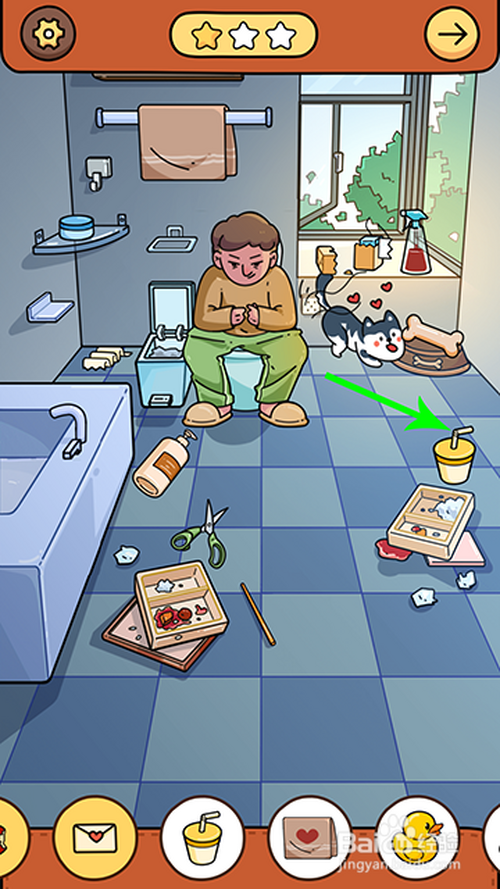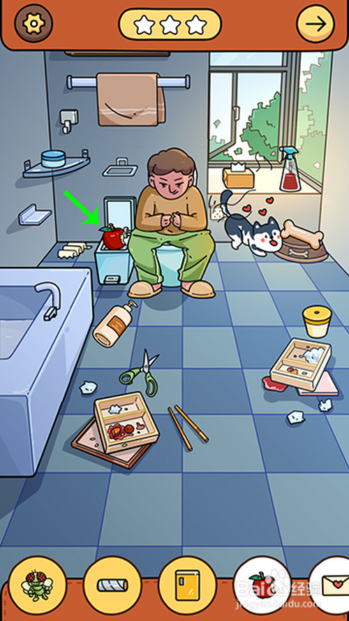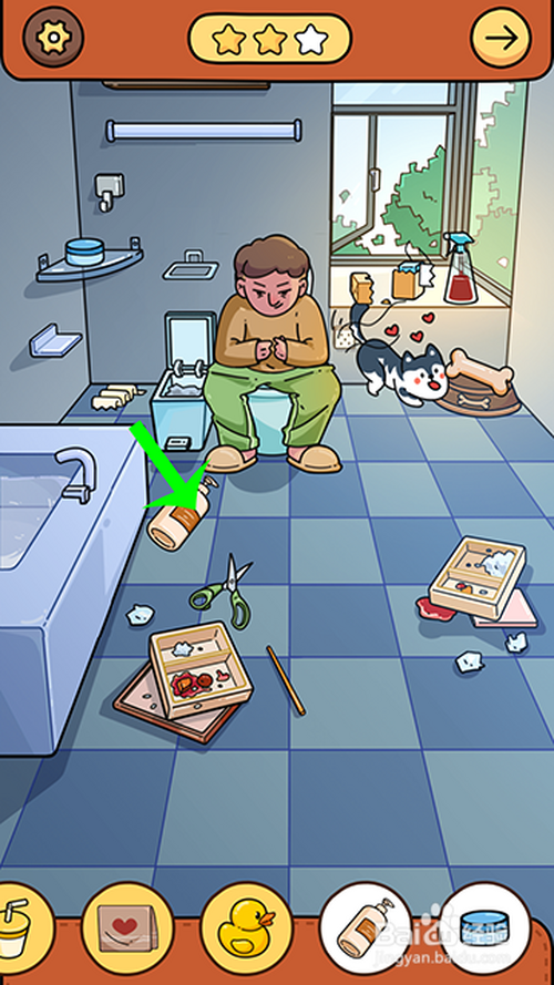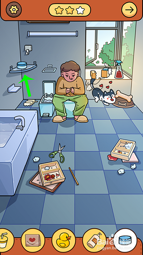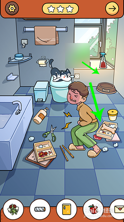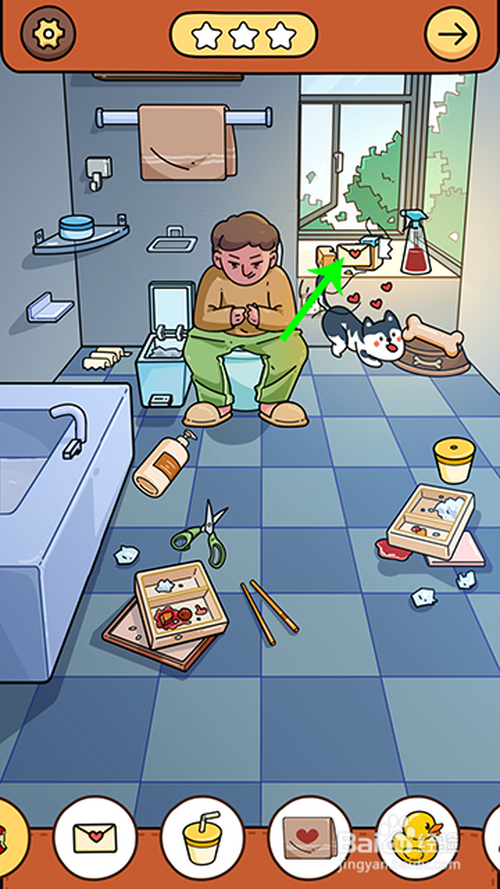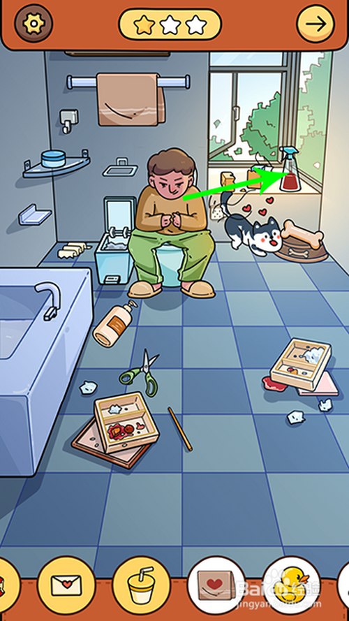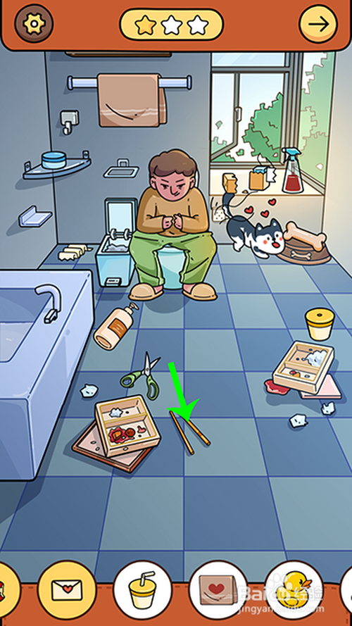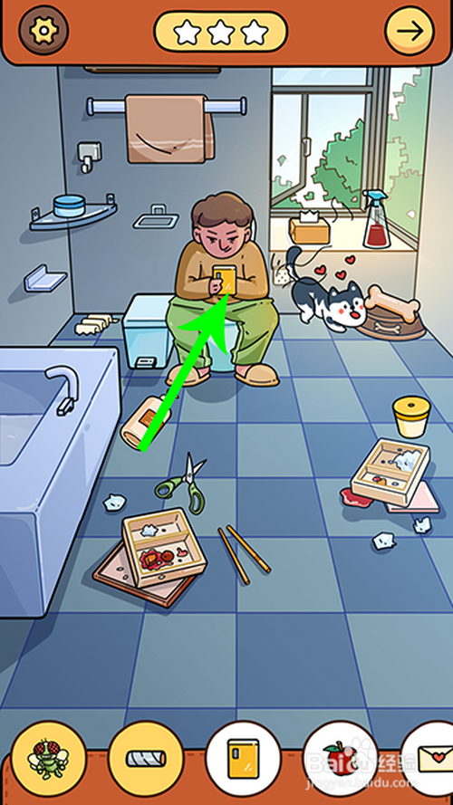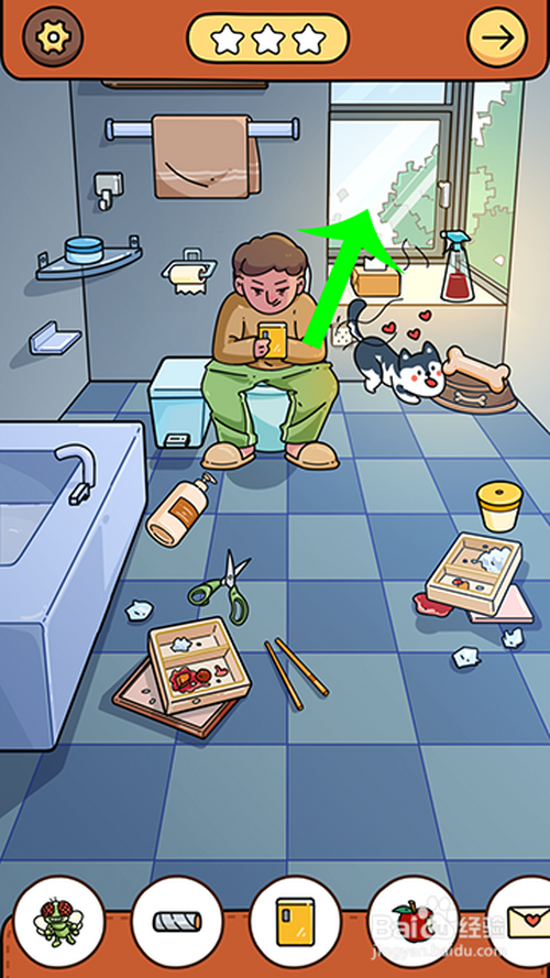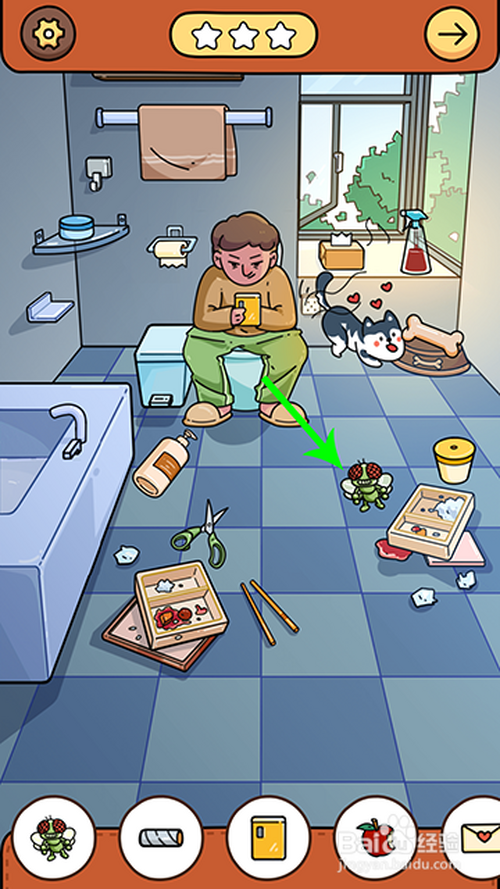 进入游戏关卡后,点击骨头放到狗盆里,狗分开马桶,人物坐到马桶上,然后,两根手指点击窗户打开,苍蝇飞进来点击收起。