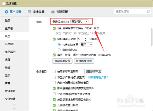在状况页面,选择“登录后状况为请勿打搅”选项。