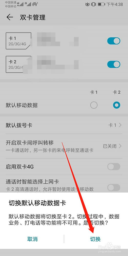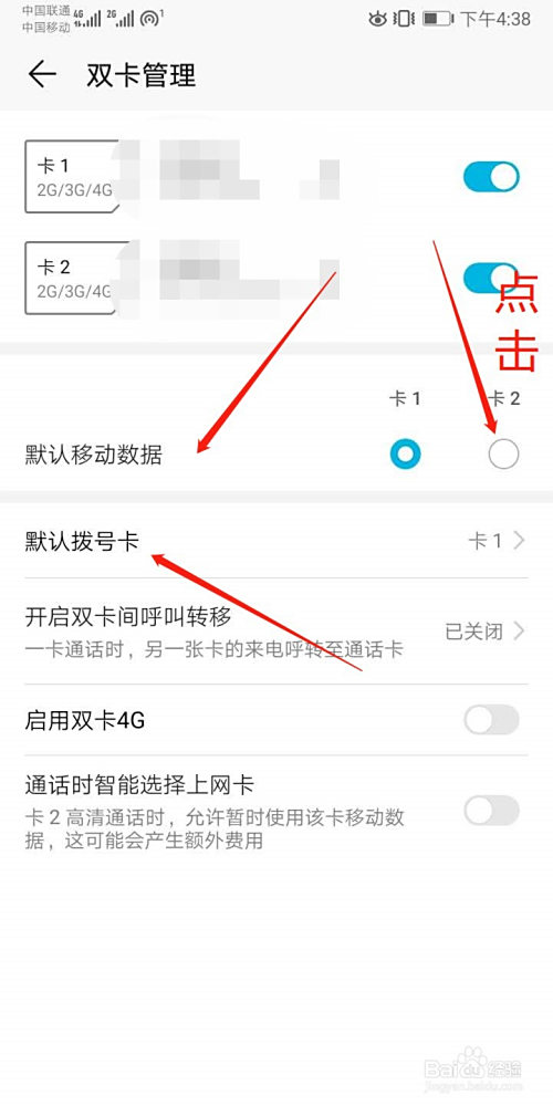 在这个页面我们既可以切换移动数据,也可以切换拨号卡,点击卡2.