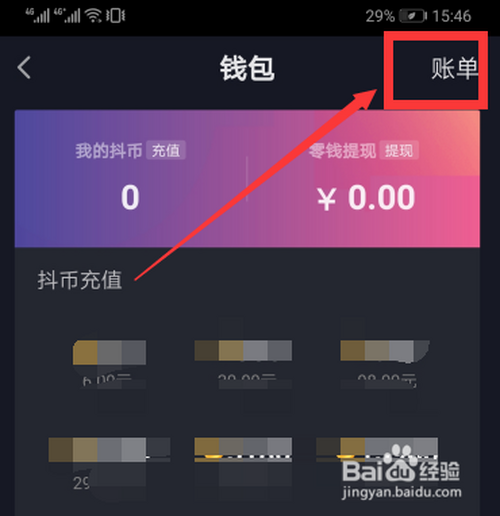 钱包界面,点击右上角“账单”。