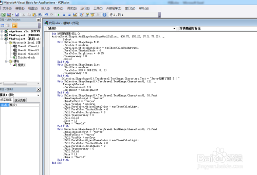 5.在VBA编纂界面,写入指定的VBA代码,然后点击封闭按钮。