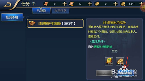 然后选中使命“哥布林的威胁”,点击右下角的主动寻路