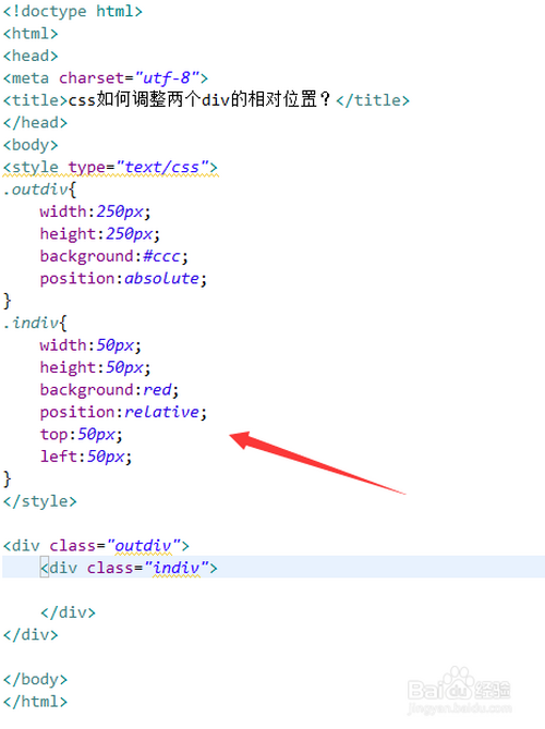 在css标签内,设置内部div的样式,界说其宽度为50px,高度为50px,布景颜色为红色,定位属性相对定位,利用top属性设置相对外部div的顶部50px,左部50px。