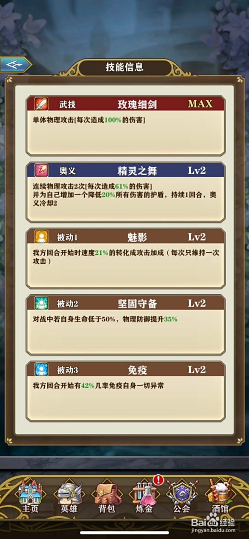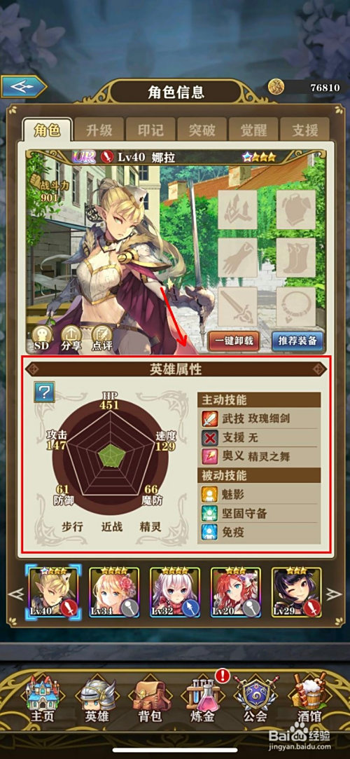 3、我们就选择第一位英雄“娜拉”,看下她的英雄属性,也可以点击左边的问号查看属性申明,娜拉是步行,近战,精灵。还有长途,人类,和飞翔,魔族,每个英雄技术都分歧。
