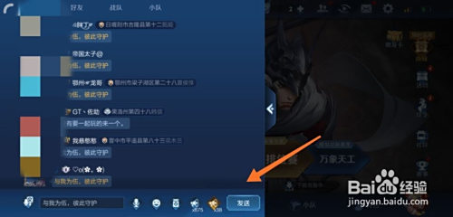 然后在聊天大厅输入‘与我为伍,彼此守护’,点击发送。