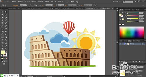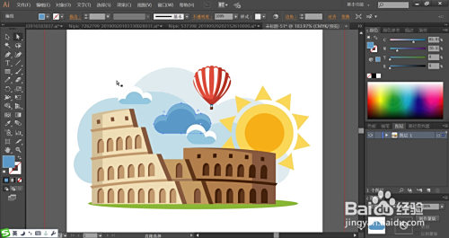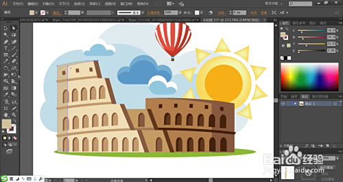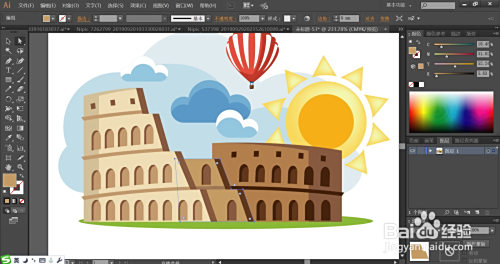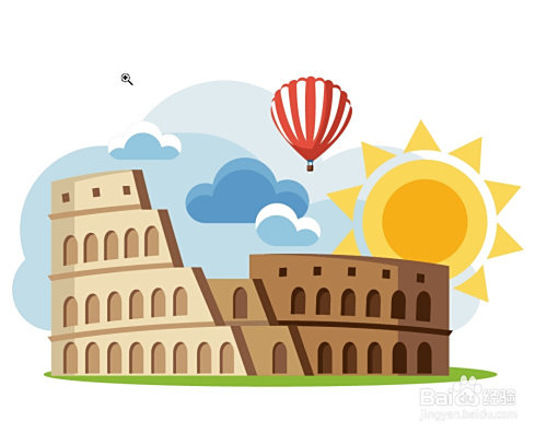 利用钢笔画出天空与云朵的细节,再画出太阳的根基轮廓路径,接着,我们画出角斗场的左侧、中心、右侧的细节路径,重点绘制正面的门洞细节路径。