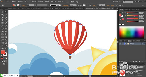 利用红色与暗红色填充热气球概况的条纹,利用白色填充热气球的本家儿体,下方的绳子与吊篮用蓝色与灰棕色搭配填充。