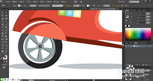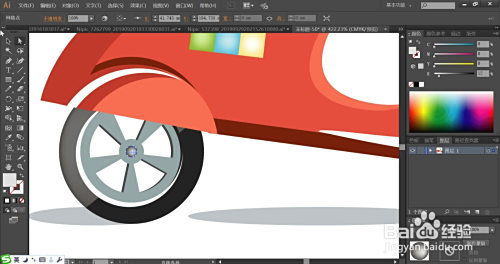 车轮利用灰白色、灰黑色、黑色搭配填充,轮胎用黑色填充,钢圈利用网格东西点击一下让其呈现灰色渐变的结果,车轮中心的圆形布局件用黑色填充并利用网格东西做出渐变色的凸出结果。