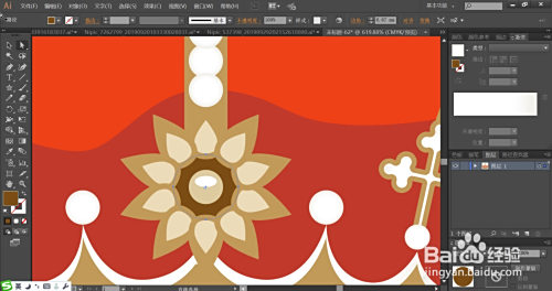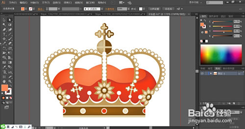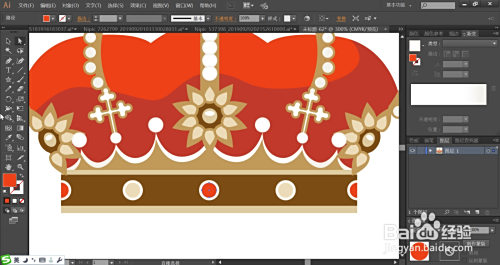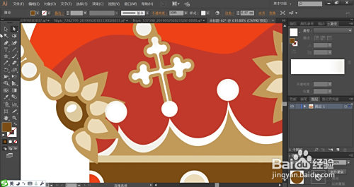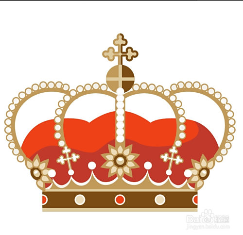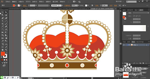 最后,我们用大红色与暗红色搭配填充王冠的中心布局件,再用网格东西点击一下上方的浅红色路径与下方的暗金色的边缘路径让其呈现渐变色的结果,完当作王冠图片设计。