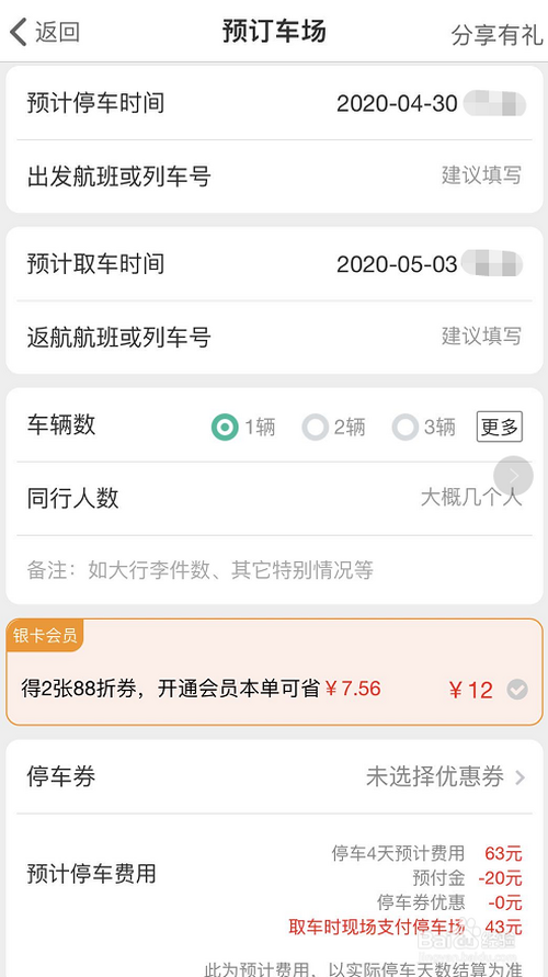 第四步,填写泊车信息:车商标、停取车时候、联系德律风等,下单预订当作功