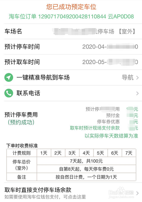 第五步,在订单界面可以看到我们预定当作功的订单,包含泊车场的导航地址、联系德律风等信息